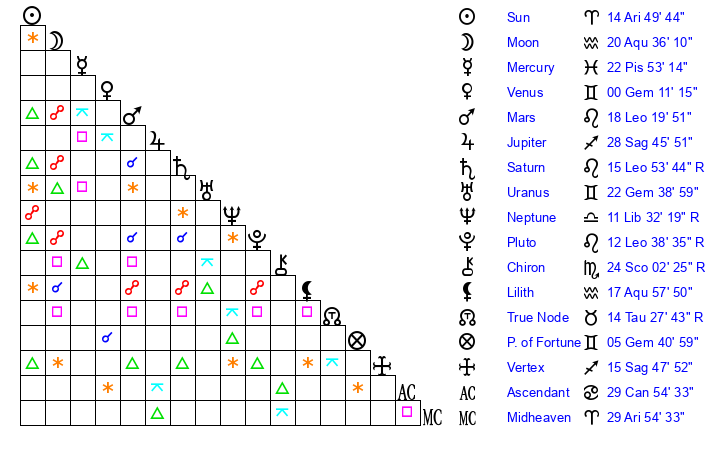 | Moon | 20 Aquarius 29 | 10 Cancer 26 | 19 Sagittarius 24 |