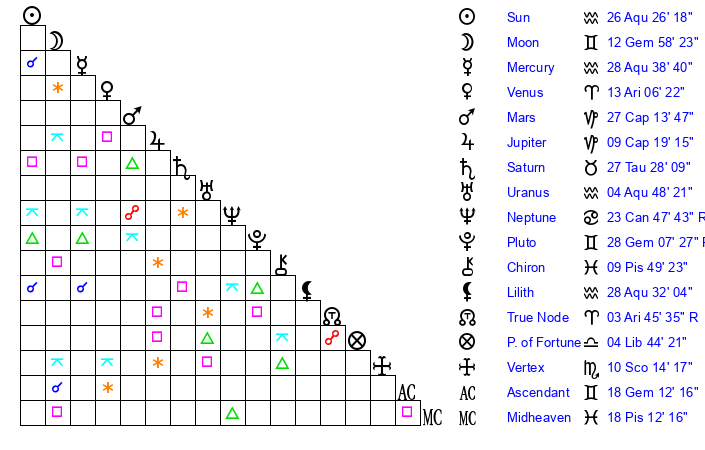 | Sun | 26 Aquarius 26 | 27 Aquarius 16 | 16 Gemini 18 |