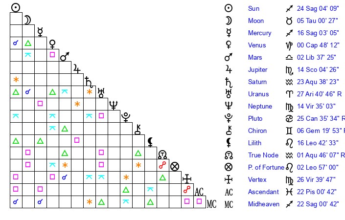 | Mercury | 16 Sagittarius 3 | 6 Sagittarius 27 | 27 Aquarius 36 |