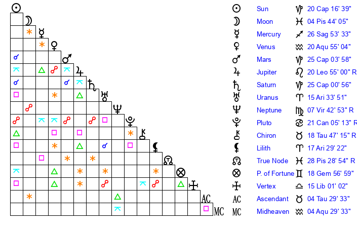 | Saturn | 25 Capricorn 14 | 15 Pisces 20 | 4 Aquarius 11 |