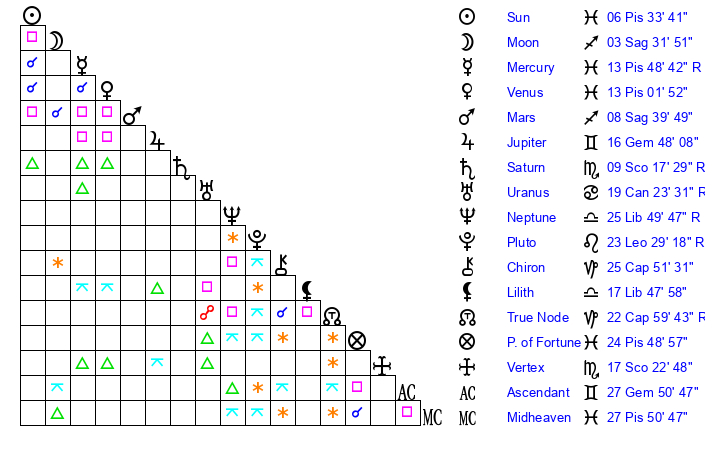 | Moon | 3 Sagittarius 24 | 6 Aquarius 26 | 22 Cancer 4 |