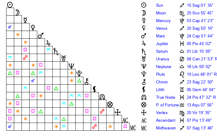 | Saturn | 1 Libra 45 | 25 Pisces 8 | 1 Libra 35 |