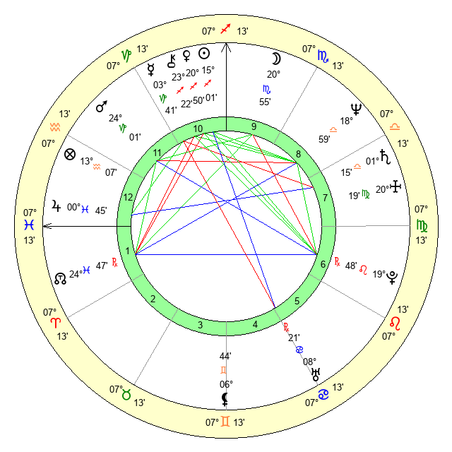 | Moon | 21 Scorpio 2 | 23 Cancer 58 | 17 Leo 18 |