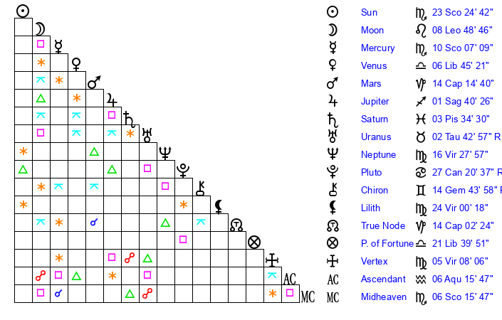 | Sun | 23 Scorpio 24 | 24 Scorpio 35 | 24 Aquarius 50 |
