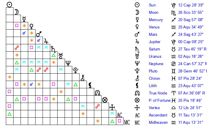 Moon | 26 Scorpio 29 | 27 Aquarius 12 | 2 Capricorn 33 |