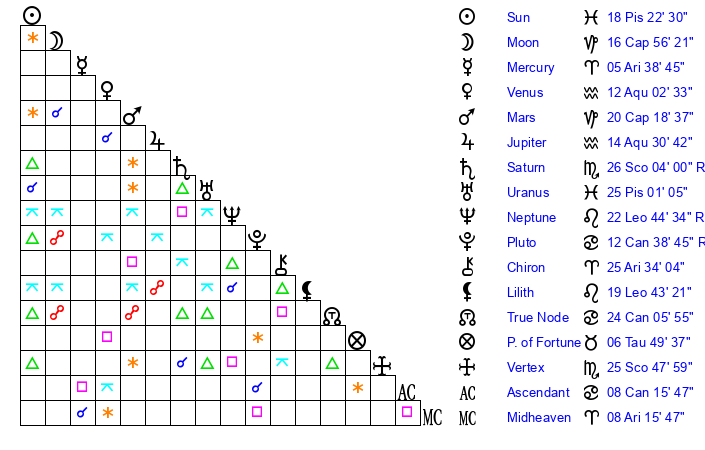 | Sun | 18 Pisces 23 | 19 Pisces 22 | 24 Gemini 46 |