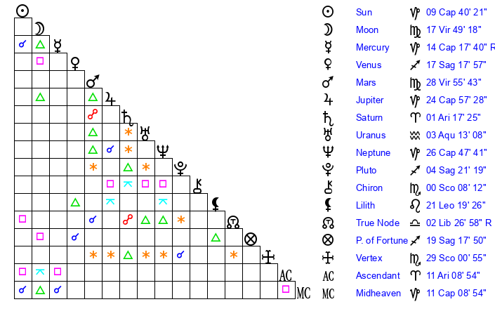 | Moon | 17 Virgo 46 | 11 Capricorn 40 | 26 Virgo 18 |