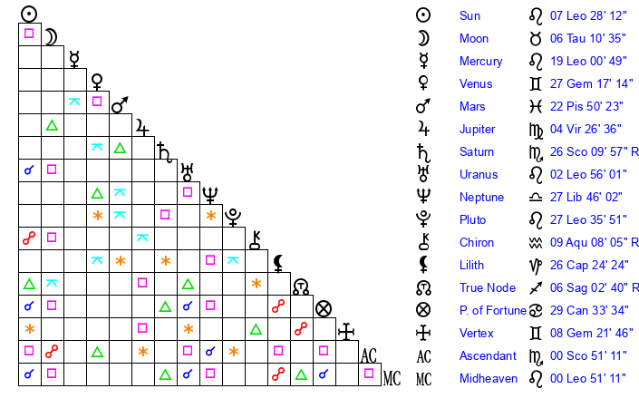 | Sun | 7 Leo 28 | 7 Leo 47 | 14 Libra 23 |