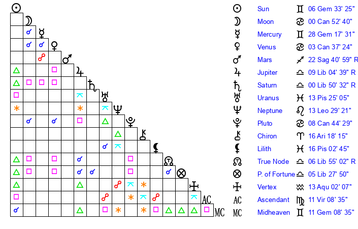 | Moon | 0 Cancer 59 | 29 Gemini 42 | 11 Aries 4 |