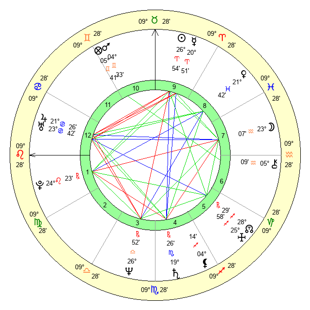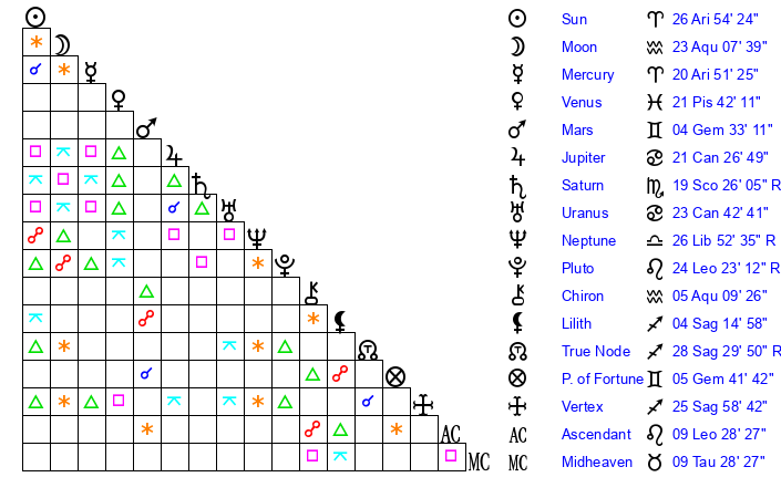 | Saturn | 19 Scorpio 57 | 26 Pisces 21 | 15 Scorpio 26 |