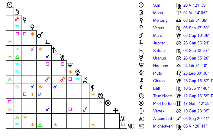 | Moon | 2 Aries 5 | 11 Gemini 23 | 11 Scorpio 14 |