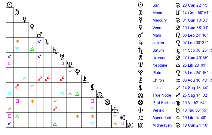 | Venus | 10 Cancer 38 | 13 Gemini 28 | 7 Libra 10 |