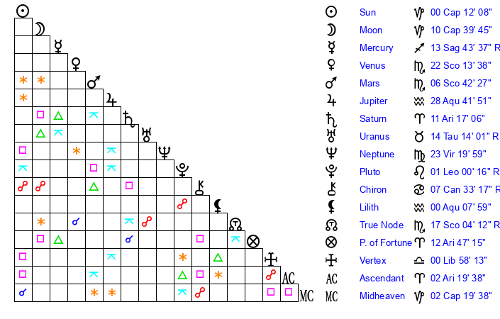 | Moon | 10 Capricorn 37 | 0 Aquarius 40 | 12 Pisces 48 |
