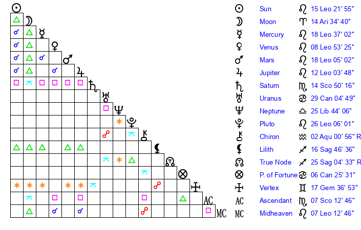 | Moon | 14 Aries 31 | 8 Aquarius 41 | 15 Scorpio 16 |