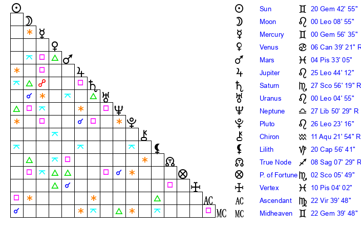 | Sun | 20 Gemini 43 | 21 Gemini 1 | 26 Leo 39 |