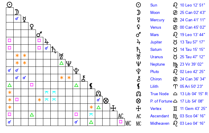 | Pluto | 2 Leo 43 | 2 Aquarius 22 | 4 Leo 19 |