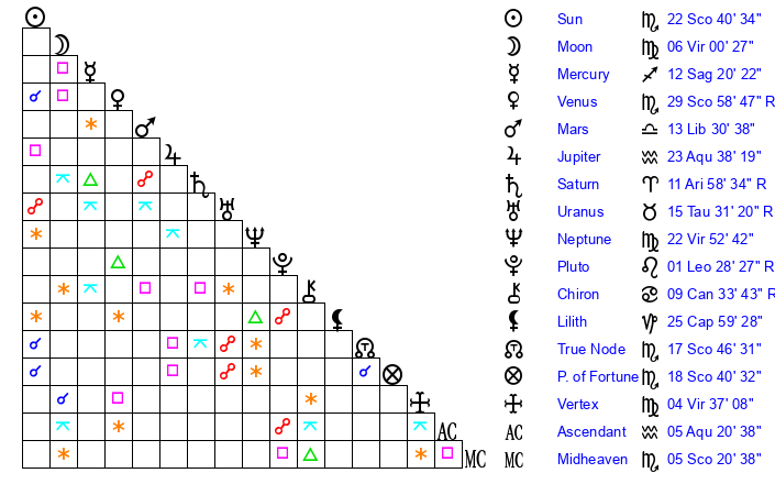 | Sun | 22 Scorpio 40 | 23 Scorpio 35 | 21 Aquarius 4 |