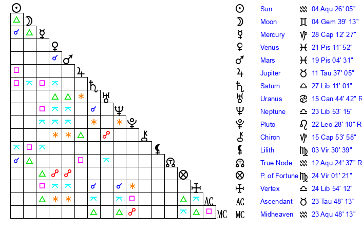 | Neptune | 23 Libra 53 | 27 Pisces 46 | 22 Libra 41 |