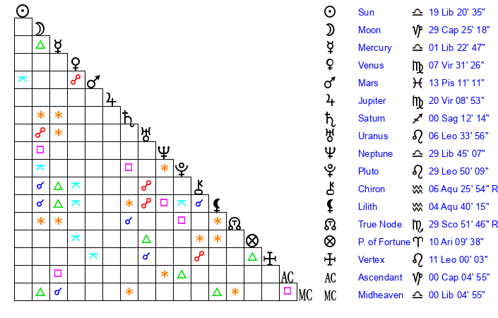 | Neptune | 29 Libra 45 | 0 Aries 13 | 2 Scorpio 3 |