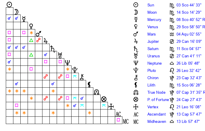 | Saturn | 11 Scorpio 32 | 25 Pisces 54 | 19 Scorpio 17 |