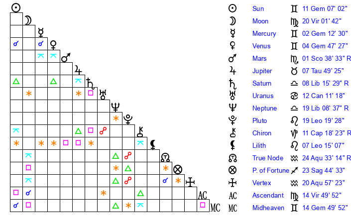 | Moon | 19 Virgo 52 | 24 Leo 48 | 4 Gemini 30 |