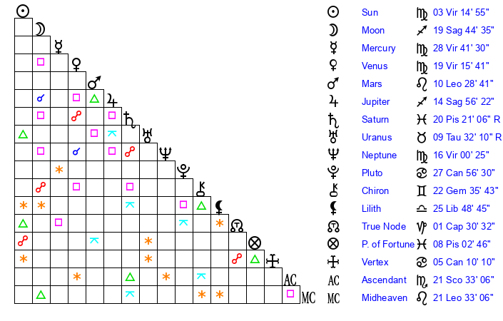 | Neptune | 16 Virgo 0 | 1 Aries 28 | 18 Virgo 44 |