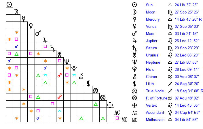 | Sun | 24 Libra 32 | 25 Libra 34 | 5 Capricorn 10 |