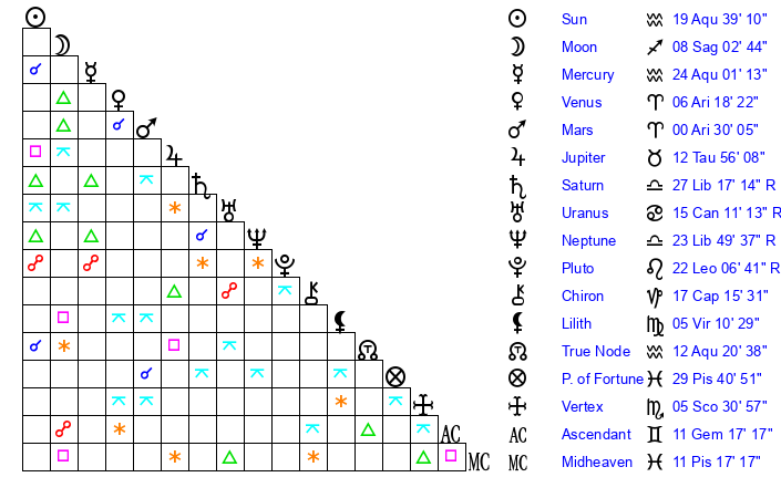 | Sun | 19 Aquarius 39 | 20 Aquarius 11 | 1 Taurus 17 |