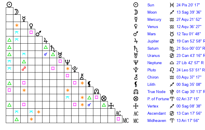 | Saturn | 21 Scorpio 30 | 22 Pisces 25 | 17 Scorpio 16 |