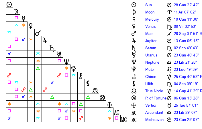| Sun | 28 Cancer 22 | 29 Cancer 11 | 6 Libra 59 |