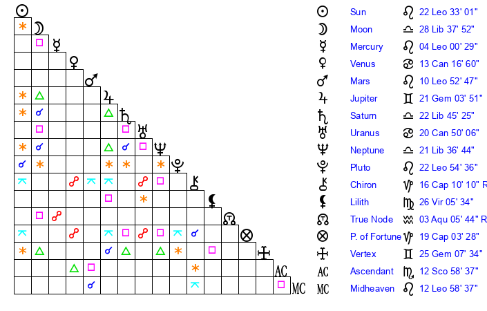 | Pluto | 22 Leo 54 | 2 Aquarius 5 | 24 Leo 47 |