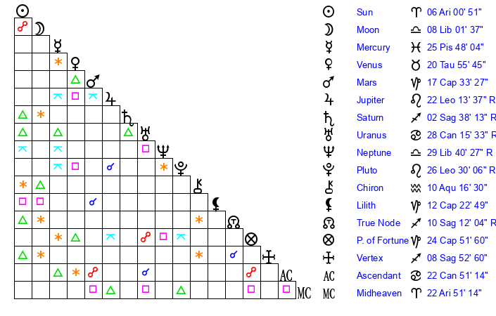 | Sun | 6 Aries 0 | 6 Aries 17 | 13 Gemini 3 |