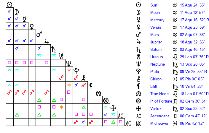 | Jupiter | 18 Aquarius 24 | 11 Gemini 16 | 2 Pisces 45 |