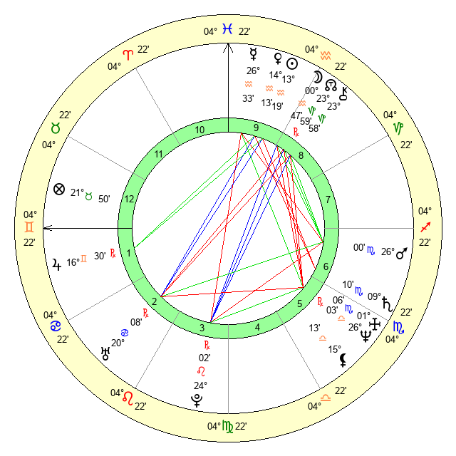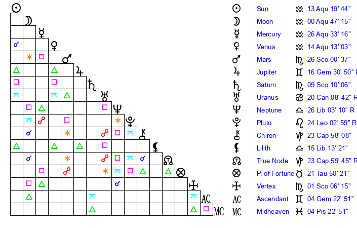 | Sun | 13 Aquarius 19 | 14 Aquarius 6 | 24 Aries 12 |