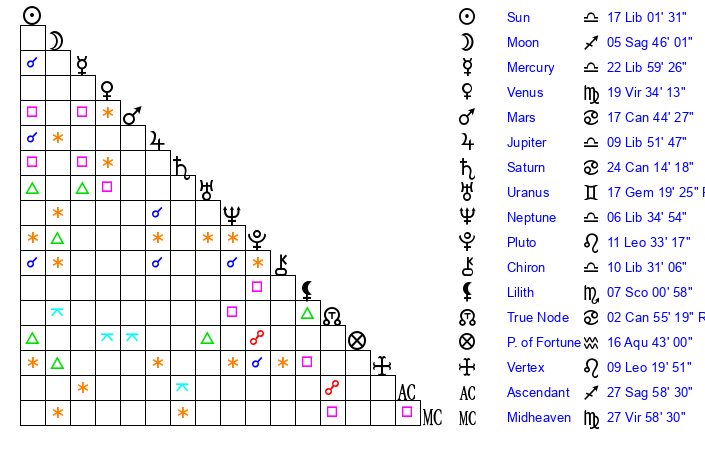 | Sun | 17 Libra 1 | 17 Libra 38 | 7 Capricorn 38 |