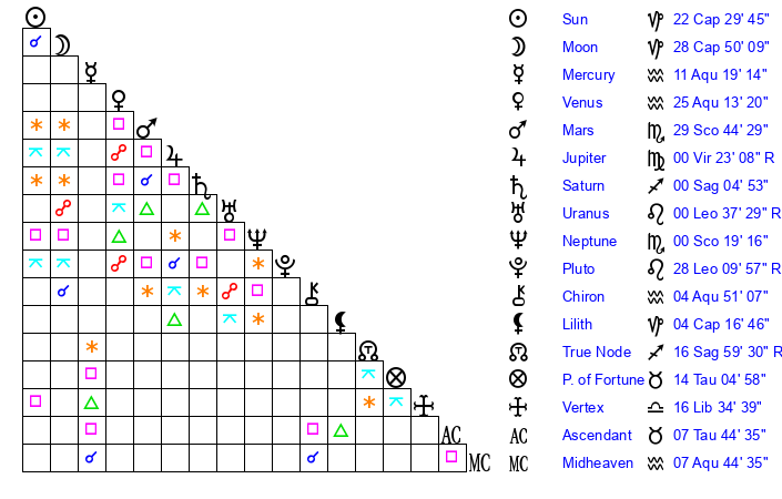 | Venus | 25 Aquarius 13 | 25 Capricorn 12 | 17 Taurus 40 |