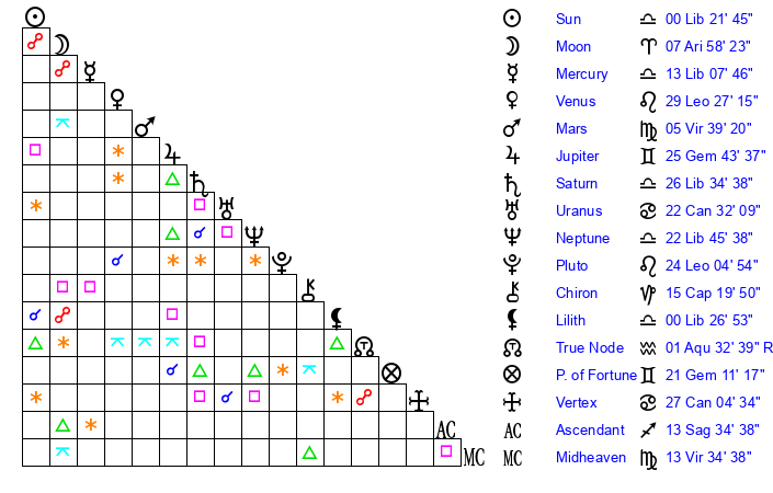 | Moon | 7 Aries 54 | 21 Libra 57 | 22 Scorpio 9 |