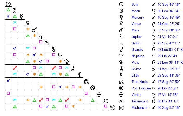 | Sun | 10 Sagittarius 45 | 11 Sagittarius 47 | 21 Aquarius 57 |