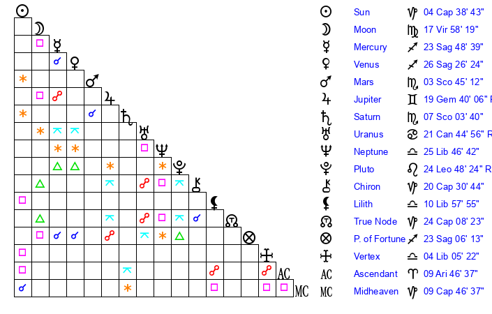 | Saturn | 7 Scorpio 32 | 25 Pisces 47 | 9 Scorpio 33 |