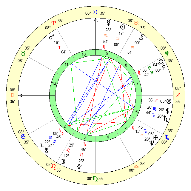 | Saturn | 21 Scorpio 13 | 17 Pisces 59 | 19 Scorpio 57 |