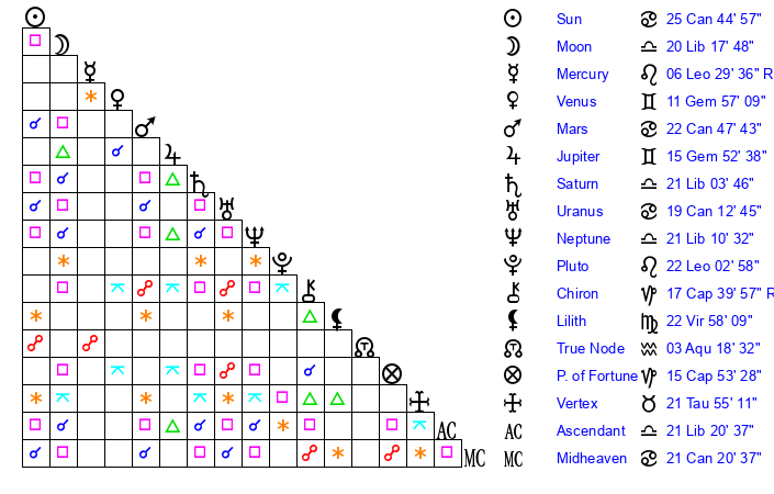 | Sun | 25 Cancer 44 | 26 Cancer 19 | 5 Libra 16 |