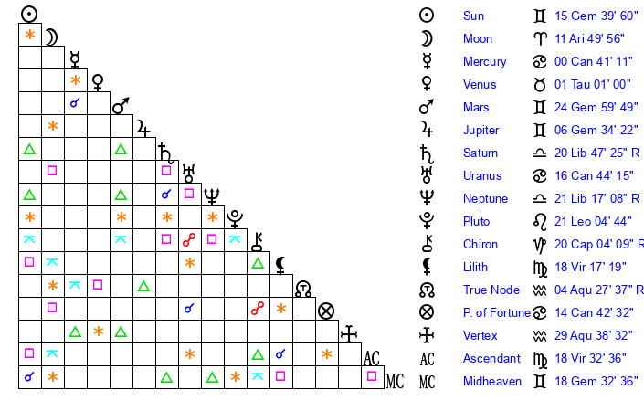 | Moon | 11 Aries 49 | 25 Libra 21 | 22 Scorpio 54 |