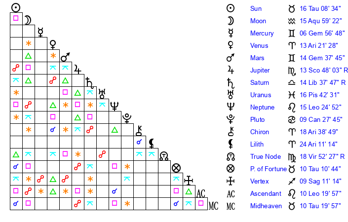 | Sun | 16 Taurus 11 | 17 Taurus 28 | 23 Leo 49 |