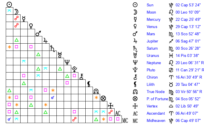| Neptune | 20 Leo 5 | 27 Pisces 13 | 17 Leo 44 |