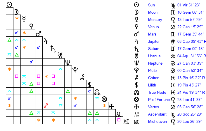 | Mercury | 13 Leo 57 | 16 Leo 6 | 2 Sagittarius 48 |