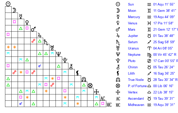 | Sun | 1 Aquarius 12 | 1 Aquarius 54 | 6 Taurus 56 |