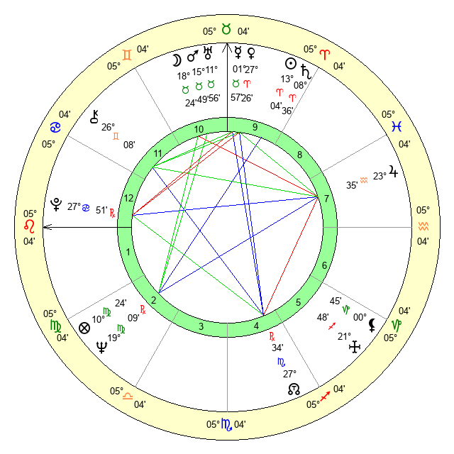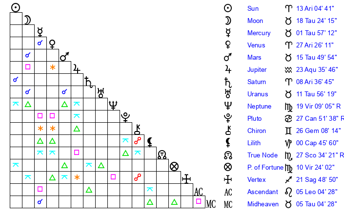 | Sun | 13 Aries 4 | 13 Aries 59 | 7 Cancer 4 |