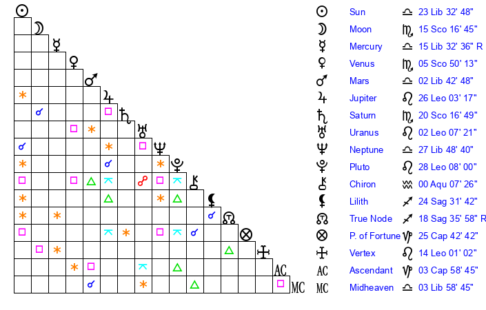 | Moon | 15 Scorpio 16 | 11 Virgo 53 | 29 Taurus 48 |