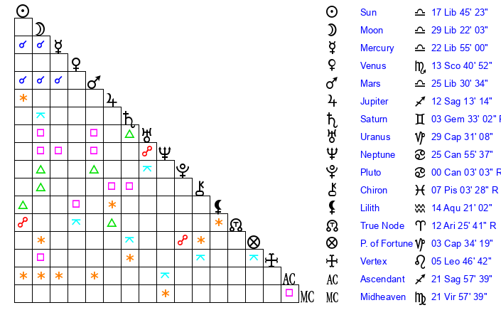 | Moon | 29 Libra 20 | 18 Gemini 2 | 19 Sagittarius 7 |