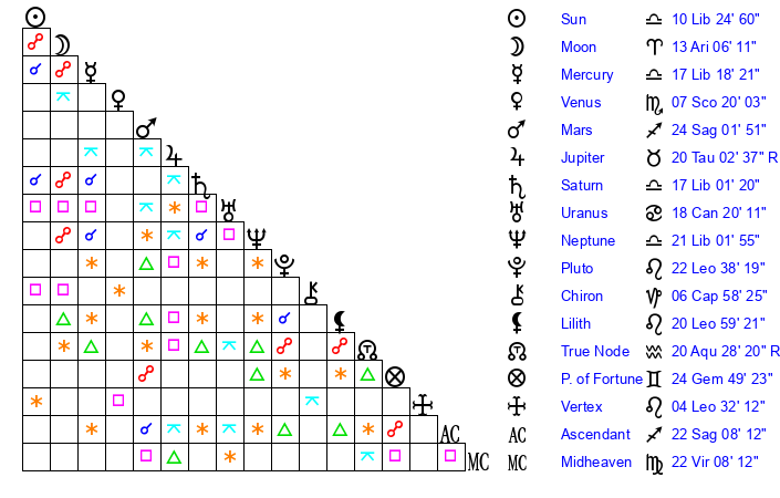 | Neptune | 21 Libra 2 | 0 Aries 28 | 23 Libra 26 |